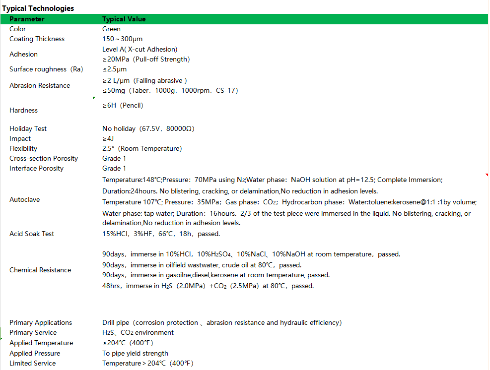 A hydrothion resistance internal coating for drill pipe, primary servicing high temperature and high pressre environment containing H2S and CO2.